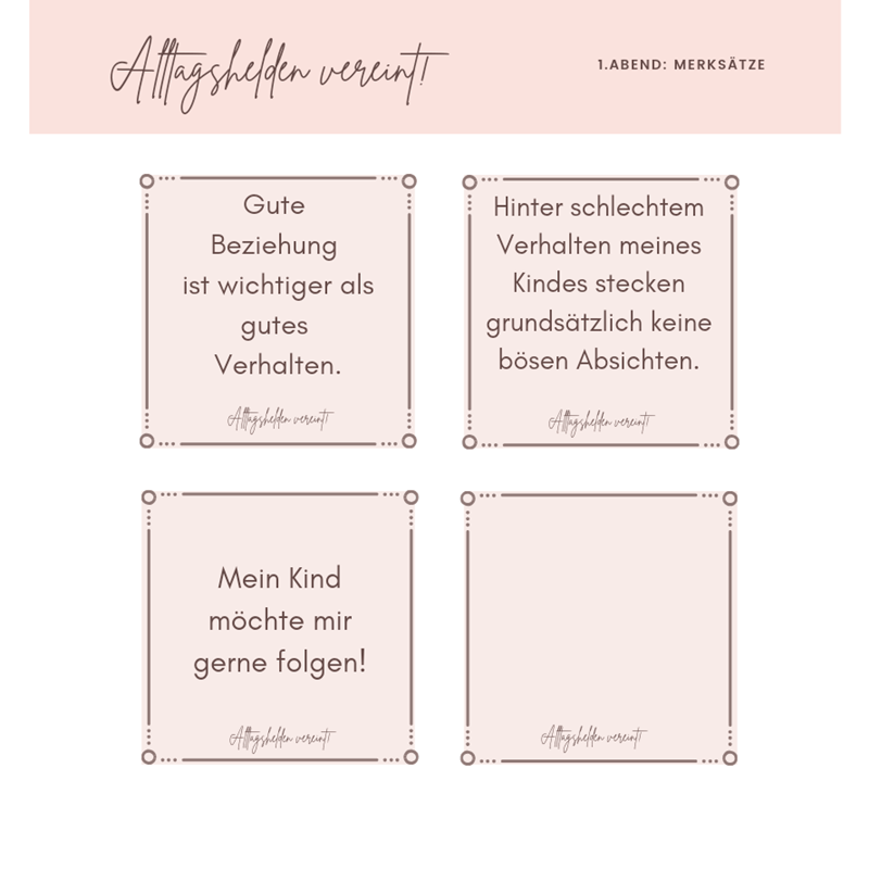 Zu jedem Abend bekommst du 3-4 Merksätze, die du ausdrucken oder als Wallpaper auf deinem Handy nutzen kannst. So verinnerlichst du die prägnanten Punkte und kannst sie noch einfacher in die Praxis umsetzen.